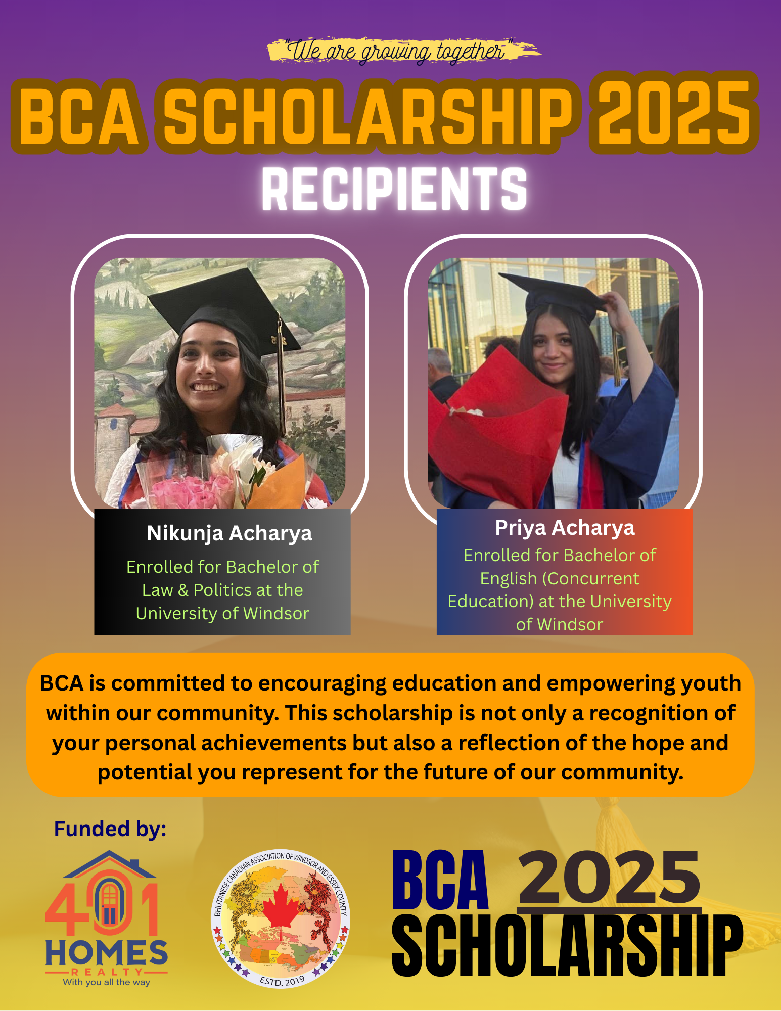 विन्डसर, ओन्टारियो – भुटानी क्यानेडियन एशोसिएसन (BCA) ले युनिभर्सिटी अफ विन्डसरमा अध्ययनरत दुई प्रतिभावान विद्यार्थीलाई BCA Scholarship 2025 प्रदान गरेको छ। सन् २०२२ देखि सञ्चालन हुँदै आएको यो कार्यक्रमले यस वर्ष कानुन तथा राजनीति विज्ञानकी विद्यार्थी निकुञ्ज आचार्य र अङ्ग्रेजी तथा शिक्षा (Concurrent) की विद्यार्थी प्रिया आचार्यलाई सम्मान गरेको हो।