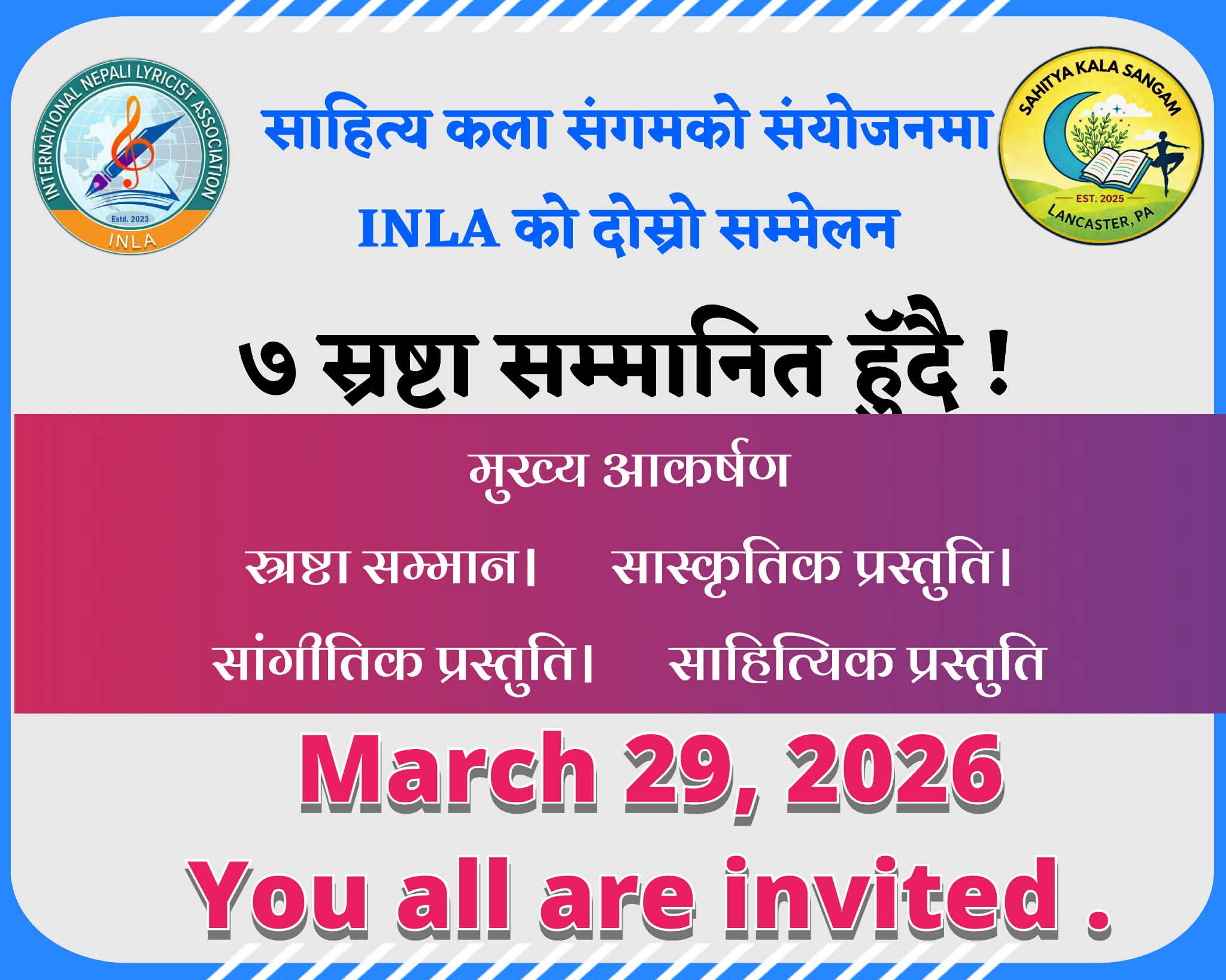अन्तर्राष्ट्रिय नेपाली गीतकार संघ (INLA) ले आफ्नो दोस्रो राष्ट्रिय सम्मेलन आगामी मार्च २९, २०२६ मा अमेरिकाको ल्यांकास्टर, पेन्सल्भेनियामा आयोजना गर्ने भएको छ।