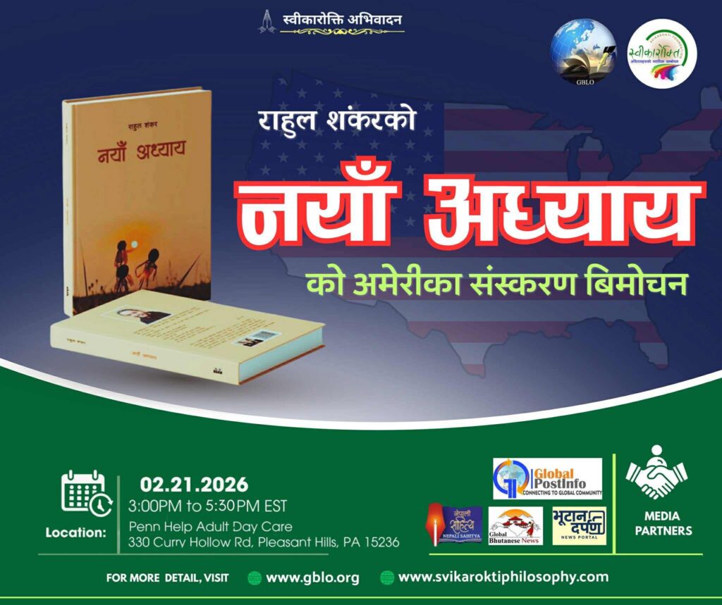 नेपाली साहित्य र दर्शनलाई प्रवासमा जोड्ने उद्देश्यसहित अमेरिकामा एकैसाथ दुई महत्वपूर्ण साहित्यिक तथा बौद्धिक कार्यक्रम आयोजना हुने भएका छन्। स्वीकारोक्ति फाउन्डेसनको आयोजनामा लेखक राहुल शंकरको कृति ‘नयाँ अध्याय’ को अमेरिकी संस्करण विमोचन तथा ‘स्वीकारोक्ति दर्शन’ विषयक अन्तरक्रियात्मक बहस कार्यक्रम फेब्रुअरी २१, २०२६ (शनिबार) सम्पन्न हुने भएको छ।