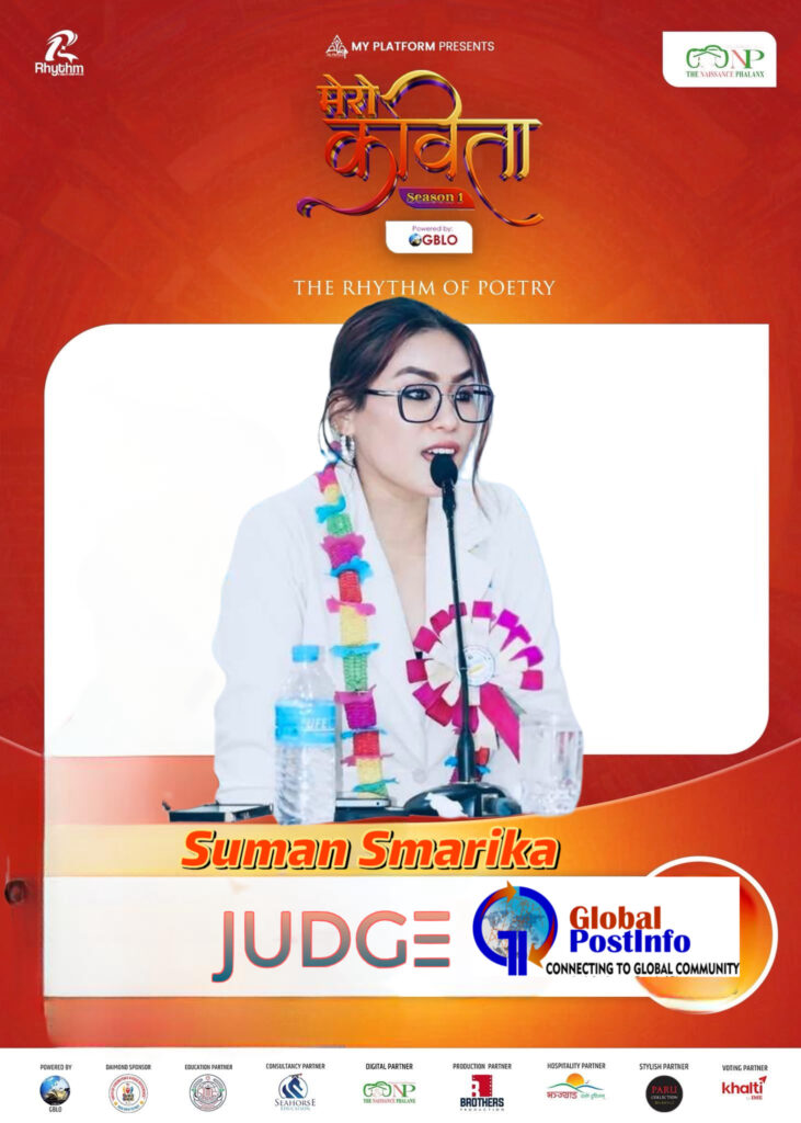 साहित्यलाई व्यावसायिक बनाउनुपर्छ भनेर साहित्यका कार्यक्रमहरुमा शसुल्क मात्रै प्रस्तुति दिने सुमन स्मारिकाको भर्खरै मात्र “साहेब” नामक गजल कृति प्रकाशित छ । हजारौं प्रसङ्शकहरुद्वरा पछ्याएकी सुन्दरी गजलकार सुमन स्मारिकालाई “मेरो कविता : द रिदम अफ पोएट्री” रियालिटी सो का निर्णायकका रुपमा प्रस्तुत गर्न पाउँदा, कार्यक्रम आवद्ध सम्पूर्ण टिम आभार व्यक्त गर्दछ ।
