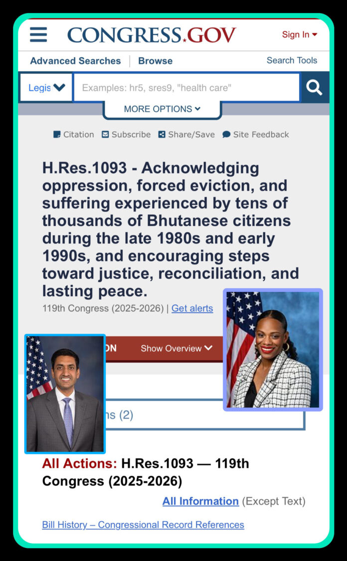 अमेरिकी सांसद रो खन्ना ले भुटानबाट विस्थापित भएका नेपालीभाषी भुटानी नागरिकहरूको इतिहास र पीडालाई मान्यता दिने उद्देश्यसहित H.Res. 1093 प्रस्ताव पुनः अमेरिकी संसद संयुक्त राज्य अमेरिका कांग्रेस मा दर्ता गरेका छन्।
