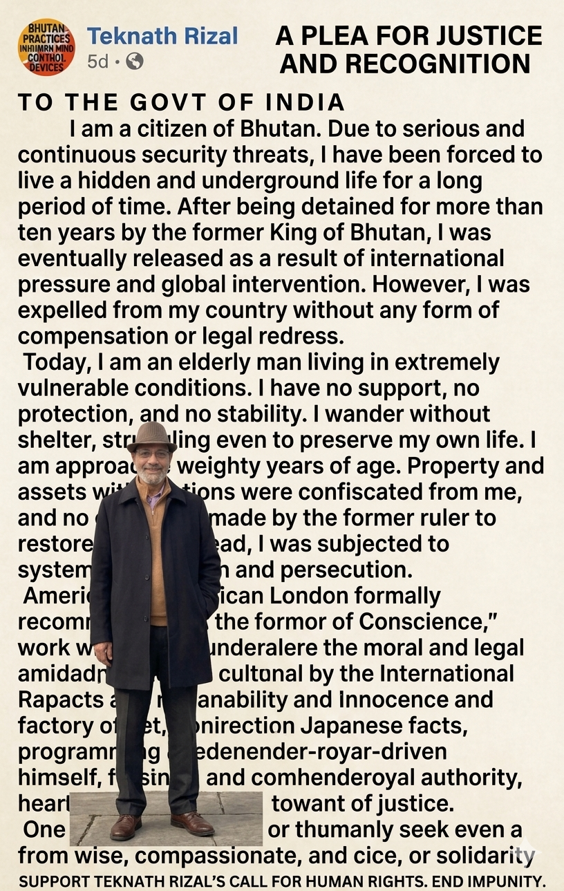 लोकतन्त्रको हिमायती दाबी गर्ने भारतले निर्दोष वृद्धको अपील बेवास्ता गर्नु हुँदैन। अन्तर्राष्ट्रिय समुदायले भुटानको “कुल राष्ट्रिय खुसी” को आवरणभित्र लुकेको सत्य हेर्नुपर्छ। एक लाख मानिस लखेट्ने राजालाई न्यायको कठघरामा ल्याउने माग पुनः उठ्नुपर्छ। मिडियाले यो कथा सार्वजनिक गर्नुपर्छ किनकि चार दशकअघि सुरु भएको अन्याय अझै टुंगिएको छैन।