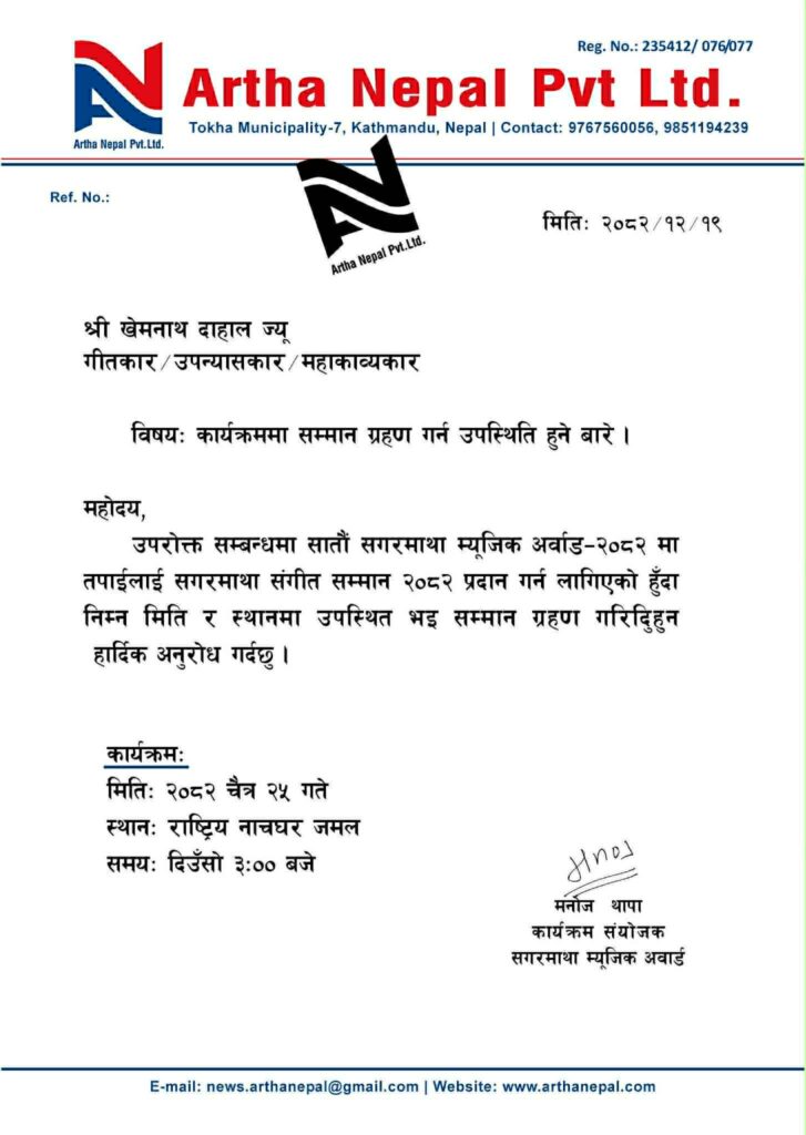 काठमाडौंमा सम्पन्न सातौं संस्करणको सगरमाथा म्युजिक अवार्ड २०८२ मा वरिष्ठ गीतकार खेमनाथ दाहाल सगरमाथा संगीत सम्मानबाट सम्मानित भएका छन्। नेपाली गीत–संगीत क्षेत्रमा उहाँले पुर्याउनुभएको योगदानको कदर गर्दै उक्त सम्मान प्रदान गरिएको हो।