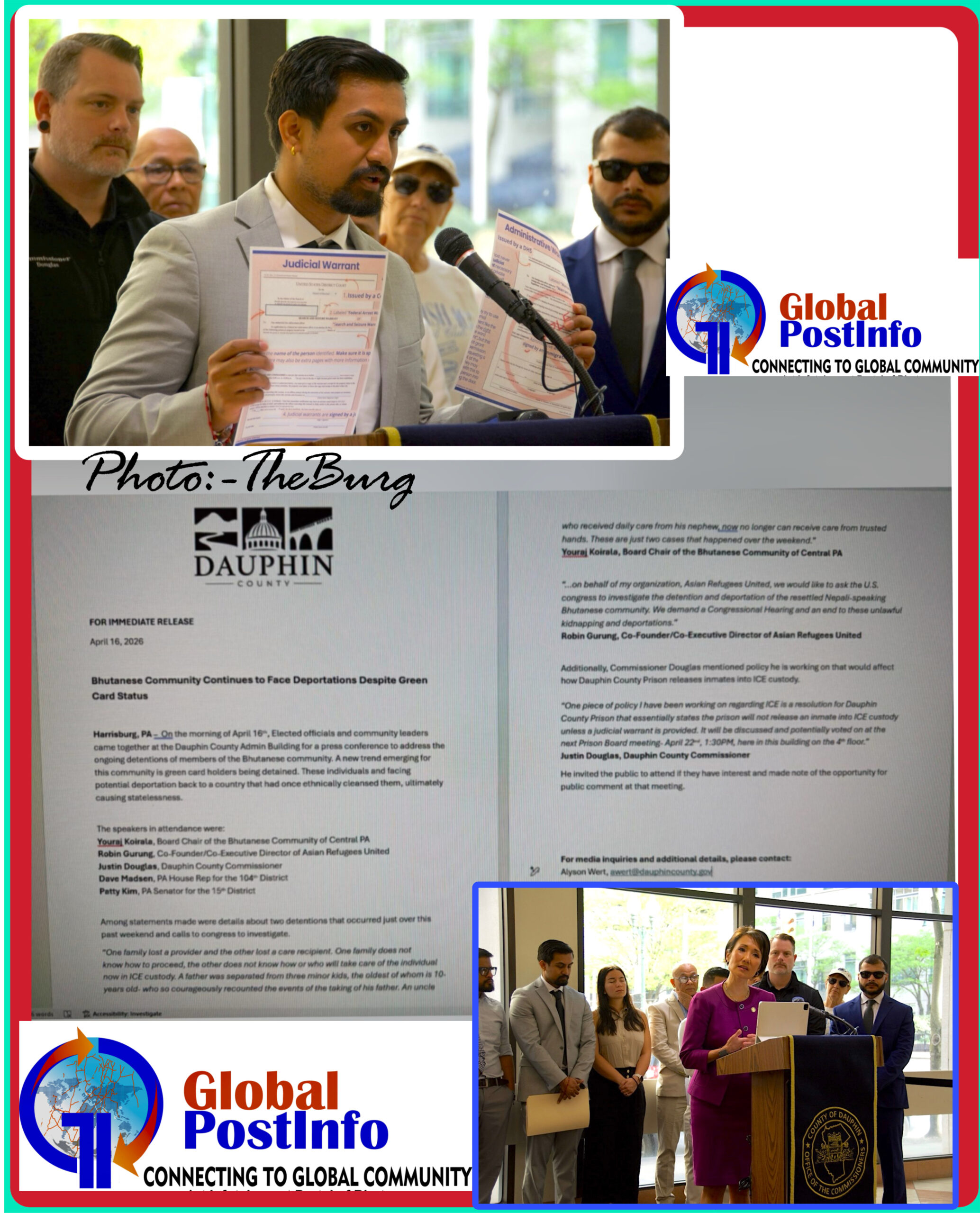 पेन्सिल्भेनियाको राजधानी हेरिसबर्गमा बिहीबार एक विशेष पत्रकार सम्मेलनको आयोजना गरी अमेरिकी आप्रवासन तथा भन्सार प्रवर्तन (ICE) द्वारा नेपालीभाषी भुटानी समुदायमाथि भइरहेको धरपकड र निर्वासनको कडा विरोध गरिएको छ। डाउफिन काउन्टी प्रशासन भवनमा आयोजित उक्त कार्यक्रममा स्थानीय राजनीतिक नेतृत्व र समुदायका अगुवाहरूले संघीय सरकारसँग यस विषयमा तत्काल हस्तक्षेप र संसदीय छानबिनको माग गरेका छन्।