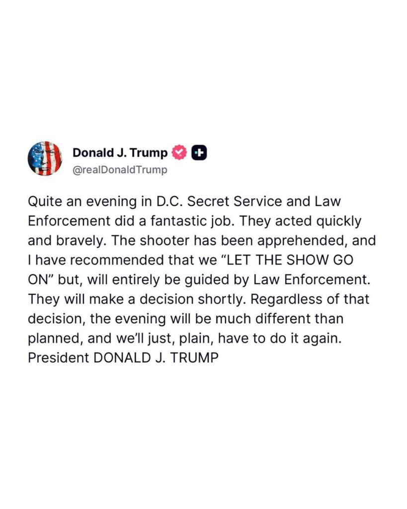 घटनापछि व्हाइट हाउसमा पत्रकार सम्मेलन गर्दै ट्रम्पले आक्रमणकारीलाई “एकल व्यक्ति” भनी वर्णन गर्दै भने कि उसलाई “साहसी गोप्य सेवाका सदस्यहरूले काबूमा लिएका हुन्।” उनले ट्रुथ सोसलमा लेखे — “वाशिङ्गटन डिसीमा कस्तो रात! गोप्य सेवा र कानून प्रवर्तनले अद्भुत काम गरे। उनीहरूले छिटो र साहसपूर्वक कार्य गरे।” ट्रम्पले यो डिनर ३० दिनभित्र पुनः आयोजना गर्ने वाचा पनि गरेका छन्।